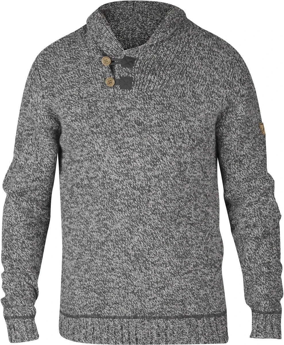 Der Lada Sweater ein Strickpullover aus Lammwollgemisch mit klassischem Schalkragen und leicht meliertem Garn. Perfekt als Alltagskleidungsstück zum Beispiel über einem Hemd oder als wärmende Zwischenschicht auf Herbst- und Winterspaziergängen. Die Knöpfung mit Corozoknöpfen und genähten Knopfschlaufen aus G-1000 Original. Rippenbund an Ärmeln und unten. Lederlogo am Ärmel. Normale Passform.