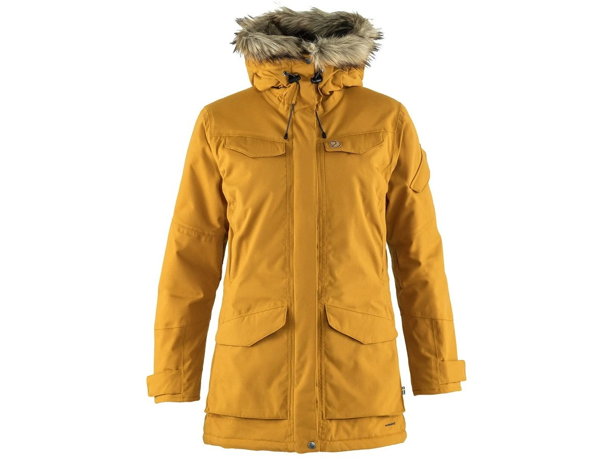 Der Nuuk Parka von FjällRäven ist ein langer, robuster Damenparka, der Gesäß und Oberschenkel sehr angenehm wärmt. Perfekte Winterjacke bei wechselnden Witterungen. Gut geschützt vor Nässe und Wind, gleichzeitig hält die Supreme Micro Loft-Füllung auch bei sehr niedrigen Temperaturen warm. Feste Kapuze mit flauschigem Fleecefutter und abnehmbarem Kunstpelzbesatz, der bei Schneefall das Gesicht schützt. Viele sehr praktische Taschen und unter anderem geräumige Balgtaschen und Handwärmtaschen im unteren Bereich, sowie zwei Brusttaschen mit Reißverschluss und Ärmeltasche für den MP3 Player oder andere kleine Dinge. An der Innenseite befinden sich zwei Meshtaschen, eine Handytasche mit Kopfhöreröffnung und Sicherheitstasche. Kordeljustierung in der Taille und am Saum und mit langem Zweiwegereißverschluss mit Schutzleiste. Klettregulierung an den Ärmelabschlüssen – eben eine perfekte Winterjacke.