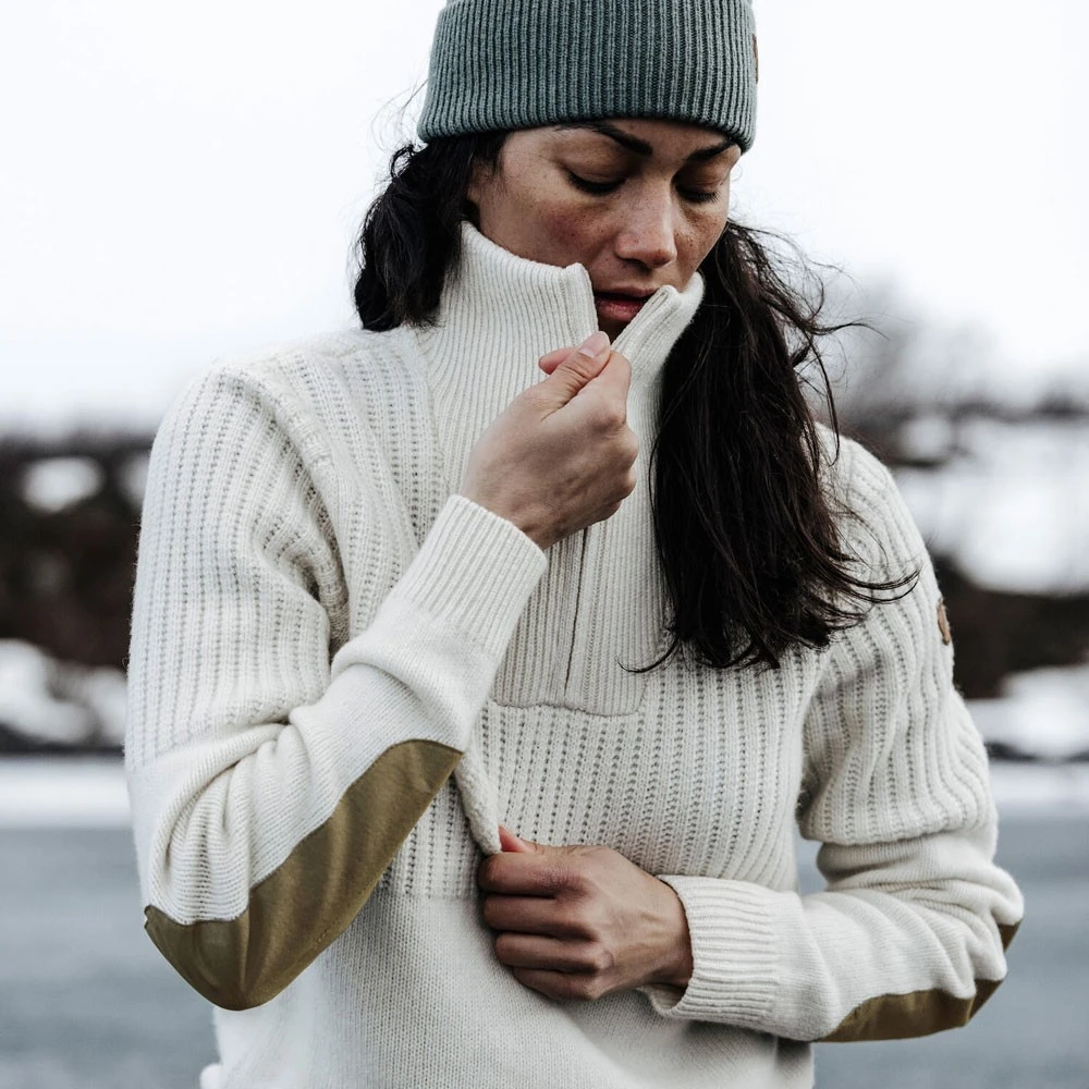 Zeitloser Pullover mit halblangem Reißverschluss, Fangmaschen im oberen Brust- und Ärmelbereich für mehr Bauschkraft und Wärme sowie klassischen Maschen im unteren Brust- und Ärmelbereich. Gefertigt aus zu 100 % rückverfolgbarer Wolle mit geripptem Kragen, Bündchen und Saum. Vorgeformte Ellbogenaufnäher aus G-1000 Stretch mit dem klassischen Fuchs-Logo aus Leder am Ärmel. Perfekt zum Wandern, für die Arbeit im Freien und für die Jagd.