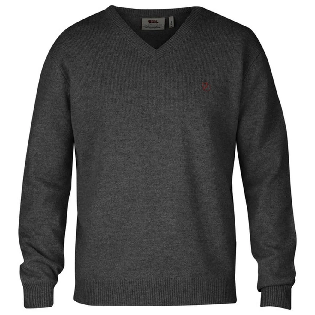 Der Shepparton Sweater ein gestrickter Lammwollpullover mit V-Ausschnitt und geripptem Halsbündchen. Rippenbündchen an den Ärmeln und unten.