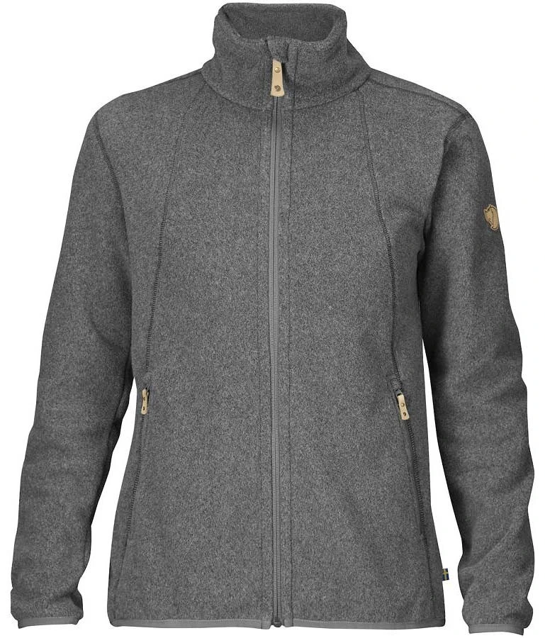 Bequeme weiche Fleecejacke von FjällRäven in weiter Passform aus Recycling-Polyester und in leicht melierter Optik. Du kannst sie auf Bergwanderungen als wärmende Zwischenschicht unter einer Oberjacke oder an schönen Sommerabenden allein über dem Hemd tragen. Das Fleecematerial wird in einem umweltfreundlichen Verfahren hergestellt, bei dem die Fäden gleichzeitig gesponnen und auch gefärbt werden. Dadurch werden für dieses Modell ca. 50 Prozent weniger Wasser und 32 Prozent weniger Energie als für eine herkömmlich erzeugte Fleecejacke verbraucht. Wunderbar oder nicht? Ein hoher Kragen, der vor schneidendem Wind schützt, mit Schutzlasche aus Fleece zwischen Reißverschluss und Kinn und zwei geräumigen Eingrifftaschen mit Reißverschluss. Alle Reißverschluss-Schiebergriffe sind aus naturfarbenem Leder.