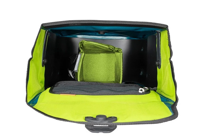 E-Mate – Extra für E-Bikes entwickelt: Die wasserdichte Fahrradtasche zum wackelfreien Verstauen von (Ersatz-) Akku plus Tagesgepäck. E-Bike-Fahrer kennen das Problem, dass ihr (Ersatz-) Akku in „normalen“ Fahrradtaschen oft hin und her rutscht. Dafür hat Ortlieb jetzt die elegante Lösung – E-Mate – entwickelt. In der Taschenmitte finden Sie ein gepolstertes, herausnehmbares Batteriefach, das den Akku aufnimmt und perfekt an Ort und Stelle hält. Daneben und darüber ist noch genügend Platz für das Tagesgepäck, wie Proviant und zum Beispiel eine Regenjacke. Das E-Bike-Display lässt sich komfortabel und sicher in der flexiblen Reißverschlussinnentasche des Deckels mitnehmen. Die Innenversteifung macht die Tasche formstabil und standfest. Und durch den innovativen Magnetverschluss wird das Öffnen und Schließen zum einfachsten auf der Welt.