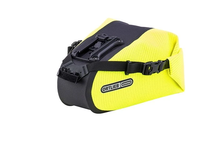 Die Saddle-Bag Two High Visibility ist eine leuchtstarke Satteltasche, in die wirklich was reinpasst! Mit einfachem Adaptersystem – für besonders leichte und dazu schnelle Handhabung. Ein echter ORTLIEB Klassiker in überarbeiteter Version. Die wasserdichte Saddle-Bag Two High Visibility besteht aus vollflächig reflektierendem Gewebe in einer aufmerksamkeitsstarken Neongelb-Schwarz Kombination für erhöhte Sichtbarkeit im Straßenverkehr. Mit 4,1 L Volumen ersetzt die Satteltasche sozusagen einen kleinen Rucksack. Ideal für sportliche Mountainbike- und Rennradfahrer und alle, die mit minimalistischem Gepäck unterwegs sein wollen. Dank komprimierbarem Rollverschluss und seitlichen Steckverschlüssen ist in ihr alles sicher und wackelfrei verpackt und trotzdem hast du schnellen Zugriff darauf. Die Saddle-Bag Two wird mit einem verstellbaren Klickverschluss direkt am Sattel befestigt. Der Adapter ist besonders leichtgängig und ermöglicht ein echt schnelles Anbringen und Abnehmen der Tasche. Außerdem ist der Klickverschluss mit dem Vorgängermodell der Saddle-Bag Two kompatibel, so kannst Du sie z. B. für verschiedene Fahrräder benutzen. Für zusätzliche Stabilität sorgt ein Klettband direkt an der Sattelstütze, was unerwünschtes Hin- und Herschwingen verhindert. Ein weiterer Vorteil – Sie ist ein optimaler Spritzschutz und ersetzt damit sozusagen das hintere Schutzblech.