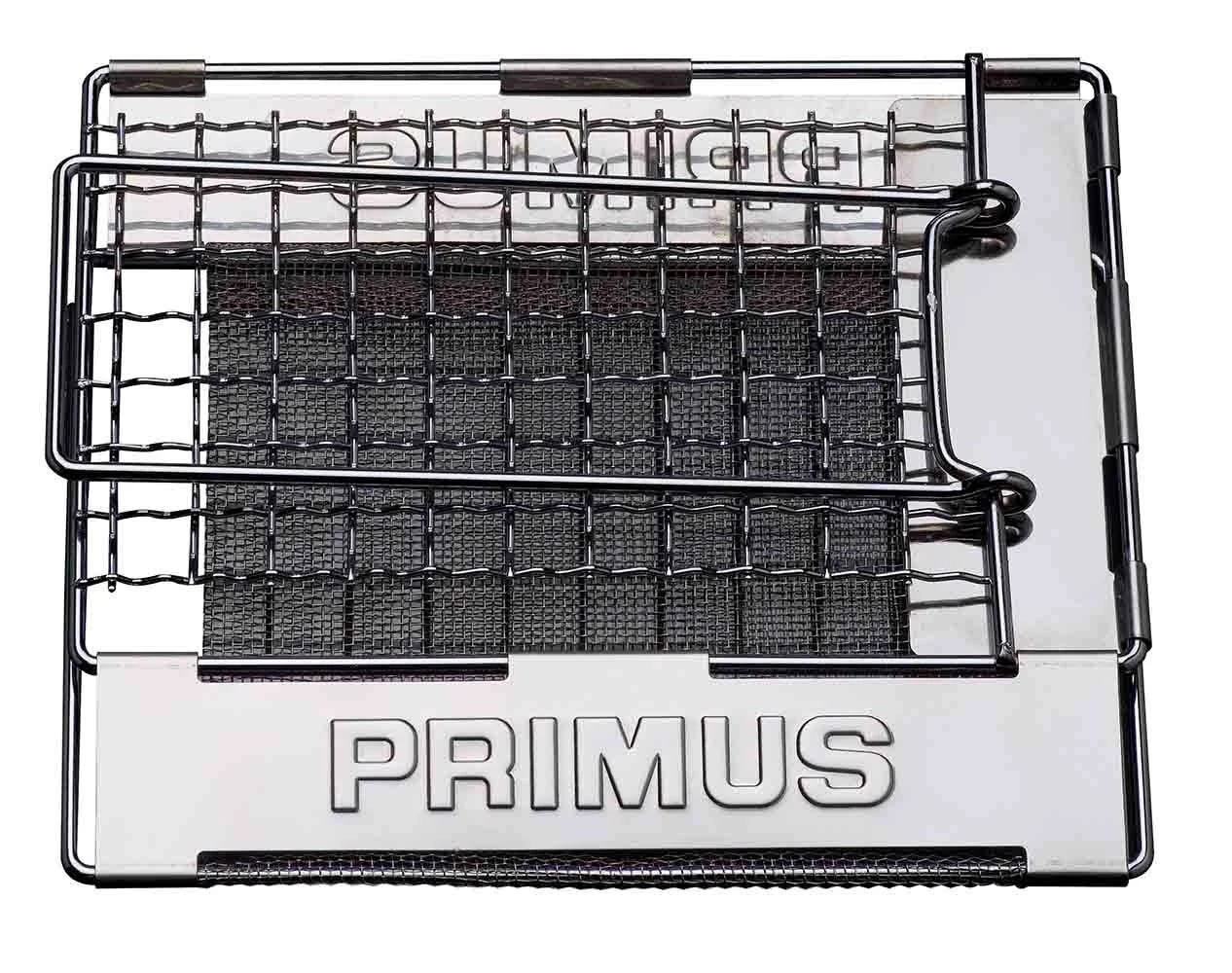 Zusammenklappbarer Toastaufsatz aus rostfreiem Stahl von Primus. Das Netz verteilt die Hitze über die Brotscheiben. Kann nur mit einem Gaskocher betrieben werden.